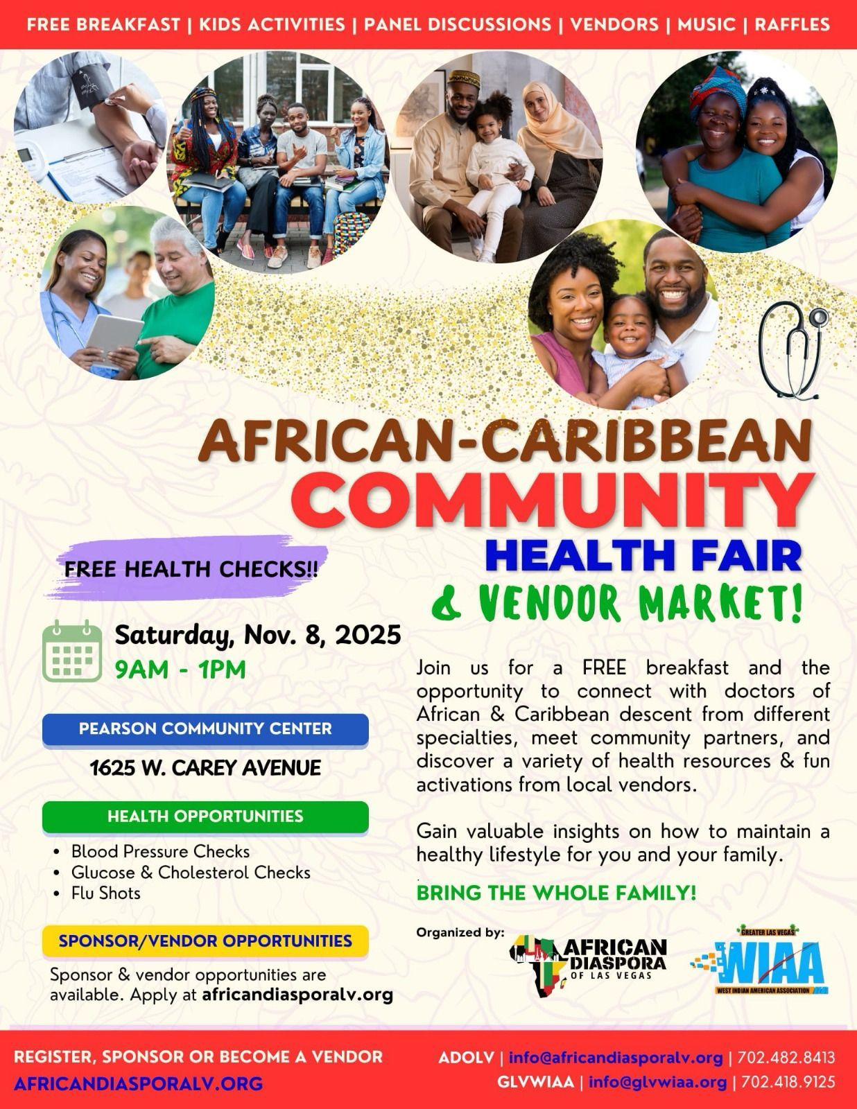 π YOU ARE INVITED! πThe African Diaspora of Las Vegas (ADOLV) & the Greater Las Vegas West Indian American Association (GLVWIAA) proudly present the 3rd Annual FREE African Caribbean Community Health Fair!