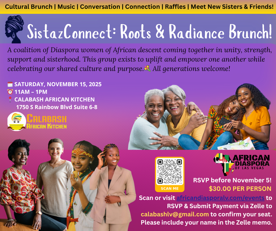 Don’t miss our next and last SistazConnect gathering of the year: the Roots & Radiance Brunch on Saturday, November 15, 2025 | 11AM – 1PM PST
