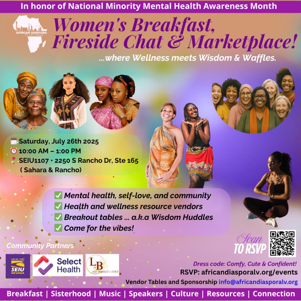 A dynamic and vibrant breakfast experience in honor of National Minority Mental Health Awareness Month, exclusively for the ladies! Join us for the Women’s Breakfast, Fireside Chat & Marketplace—a beautiful gathering centered on mental and physical wellness. Come nourish your body, uplift your mind, and connect with an empowering community of women.